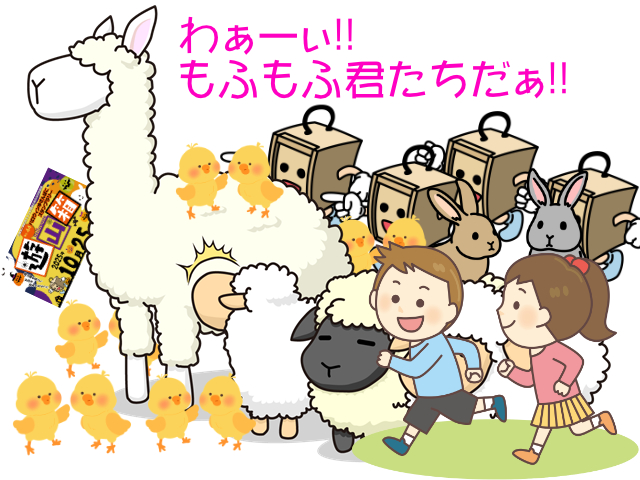 | 今回予定されている、もふもふサンたち ヒツジさん・ 白ヤギさん・ 黒ヤギさん・ わんちゃん・ウサギちゃん モルモットちゃん・ チャボちゃん・ガチョウさん・アヒルさん・カモさん 七面鳥さん・ニワトリさん・ホロホロ鳥さん・ハツカネズミちゃん・ ヒヨコちゃん 展示観察用:大型インコさん・ 中型インコさん・シマリスさん・ハリネズミさん |