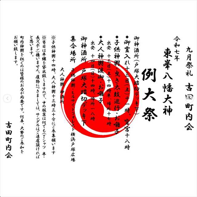 9/13(土)・9/14(日)吉田町内会も例年通り、東峯八幡社の例大祭を行います。